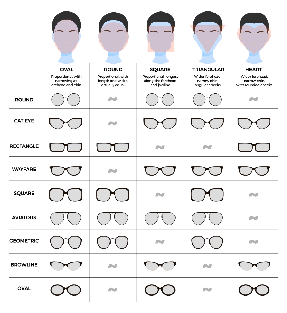 Generally, light colored and rimless frames work best, although aviator, butterfly and low-triangle styles also work well.